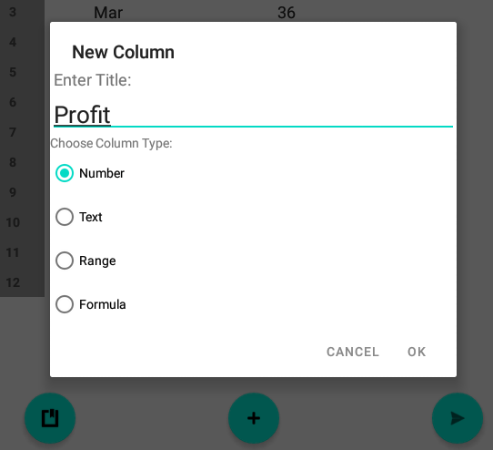 The middle button near the bottom of the table screen allows addition of new columns to the right of the table. Activating it opens a dialog where you can enter the column title (for a “Number” or “Text” column), variable name and numerical limits (for a “Range” column), or a variable name and mathematical formula (for a “Formula” column). (Hints are shown for each of these when the entry is blank.)
