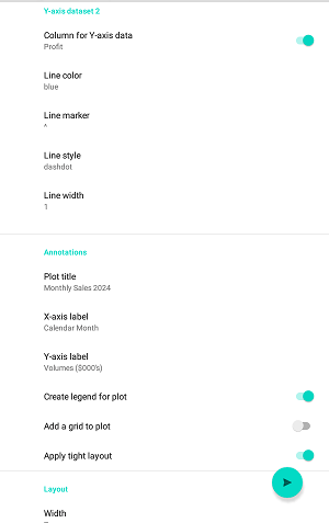 When using the options screen it is important to recall which graph or plot type has been selected, as well as the names of the data columns as these are used to configure the visualization; in case of uncertainty it is possible to go back to the table view, preserving all currently set options, by using the back icon or “swipe left” depending upon your device’s OS version. The options are laid out by category; the last two categories “Annotations” and “Layout” are common to all of the graph or plot types. When you are satisfied with the option configurations the button at the bottom-right of the screen opens a new view showing the graph or plot.